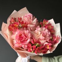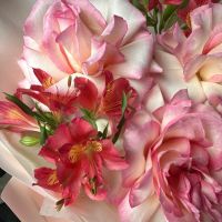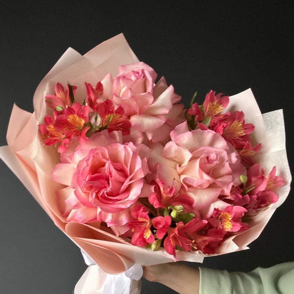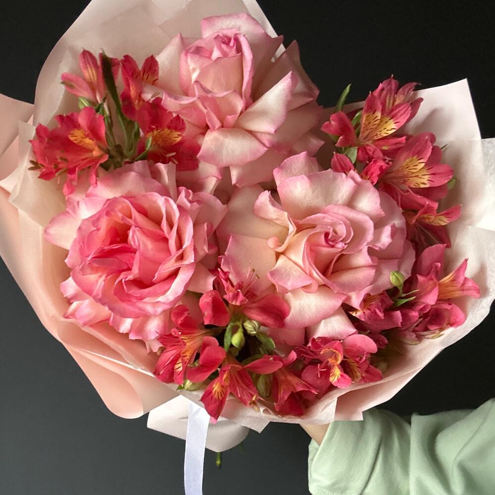 Розы французские/альстромерии/упаковка/лента.