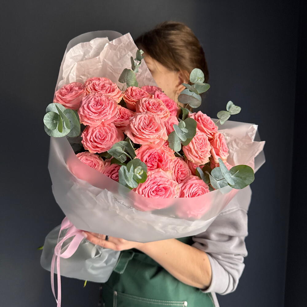 Нежный и элегантный букет из розовых кустовых роз с веточками эвкалипта — воплощение природной гармонии и утончённой красоты. Контраст бархатистых соцветий и серебристо‑зелёной листвы создаёт свежий, стильный образ, который подойдёт для любого повода.
