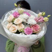Хризантемы кустовые/роза кустовая/диантусы/роза одноголовая/эустомы)/тишью/упаковка/лента