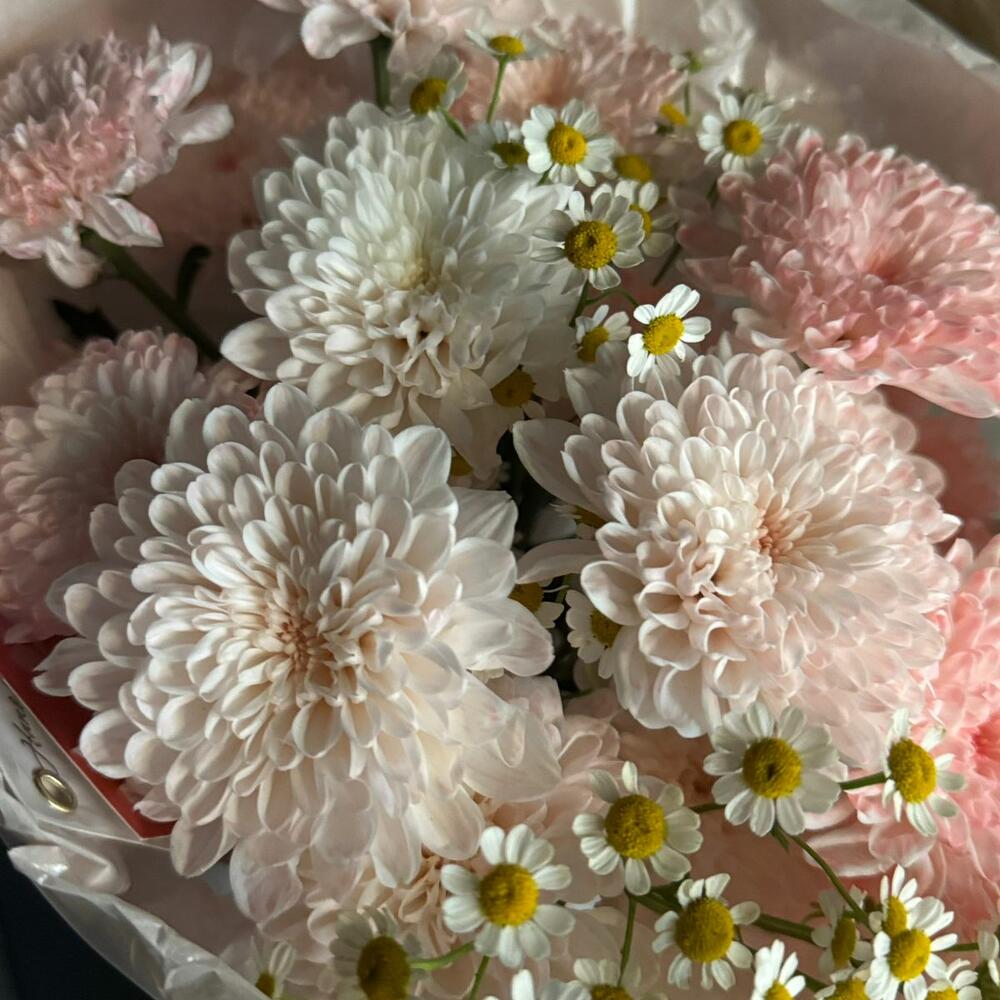 Лёгкий, воздушный букет из кустовых хризантем и матрикарии напоминает о летнем луге — он выглядит естественно, свежо и элегантно одновременно. Сочетание пышных соцветий и мелких изящных цветков создаёт гармоничную композицию, которая подойдёт для разных поводов.