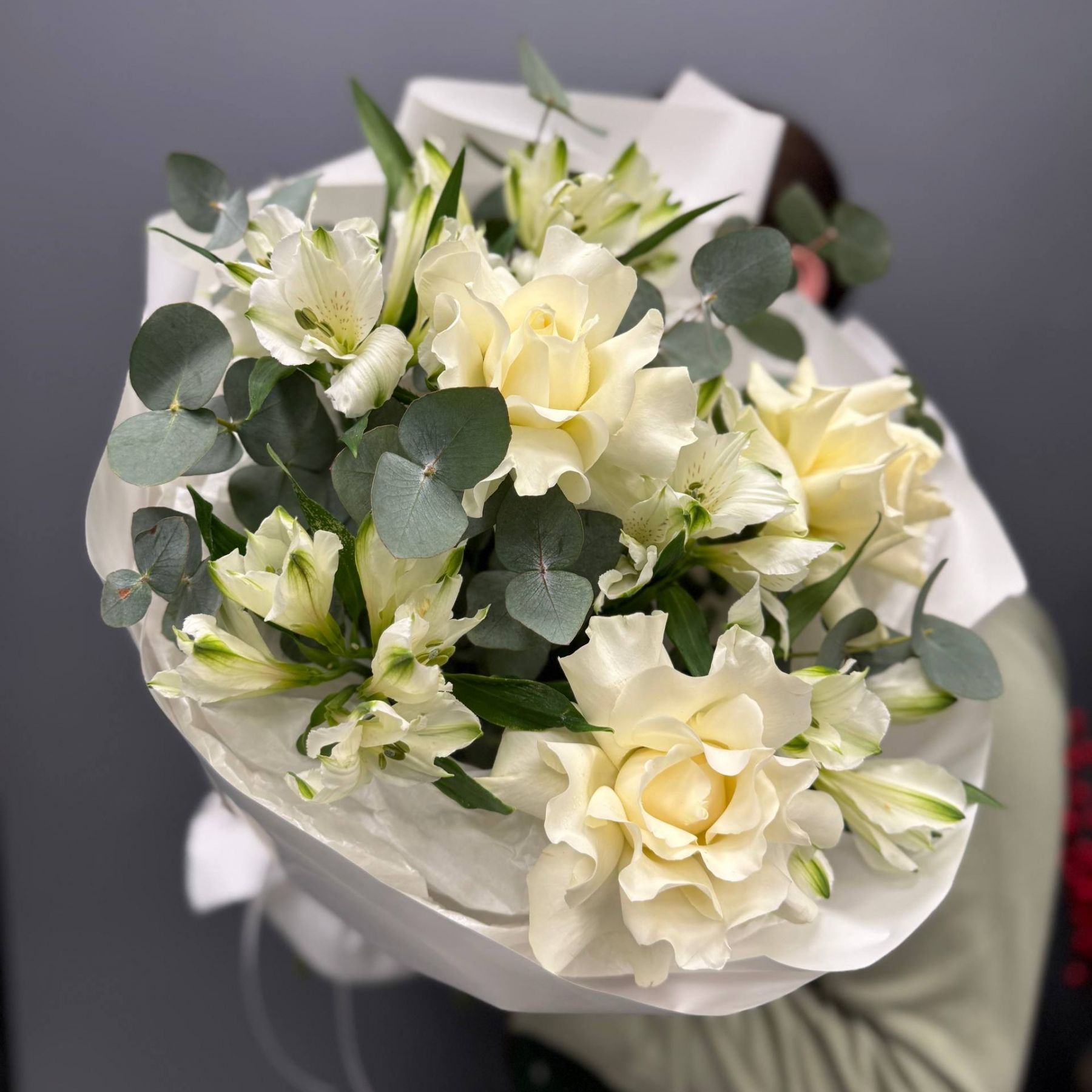 Розы французские-3 шт./альстромерии-4 шт./эвкалипт/упаковка/лента.