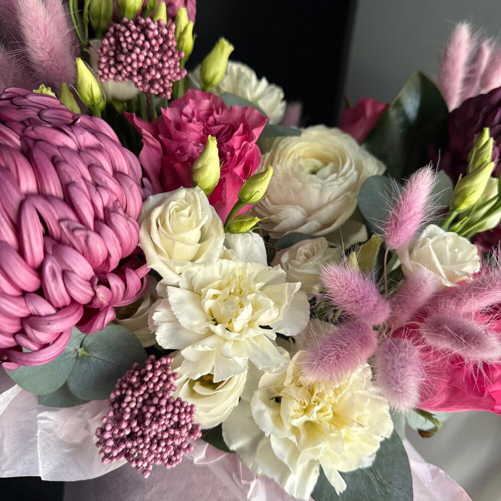 Хризантемы Бигуди-3 шт./розы сортовые-4 шт./диантус-3 шт./эустома-4 шт./озотамнус/эвкалипт/лагурус/оазис/шляпная коробка/тишью/лента