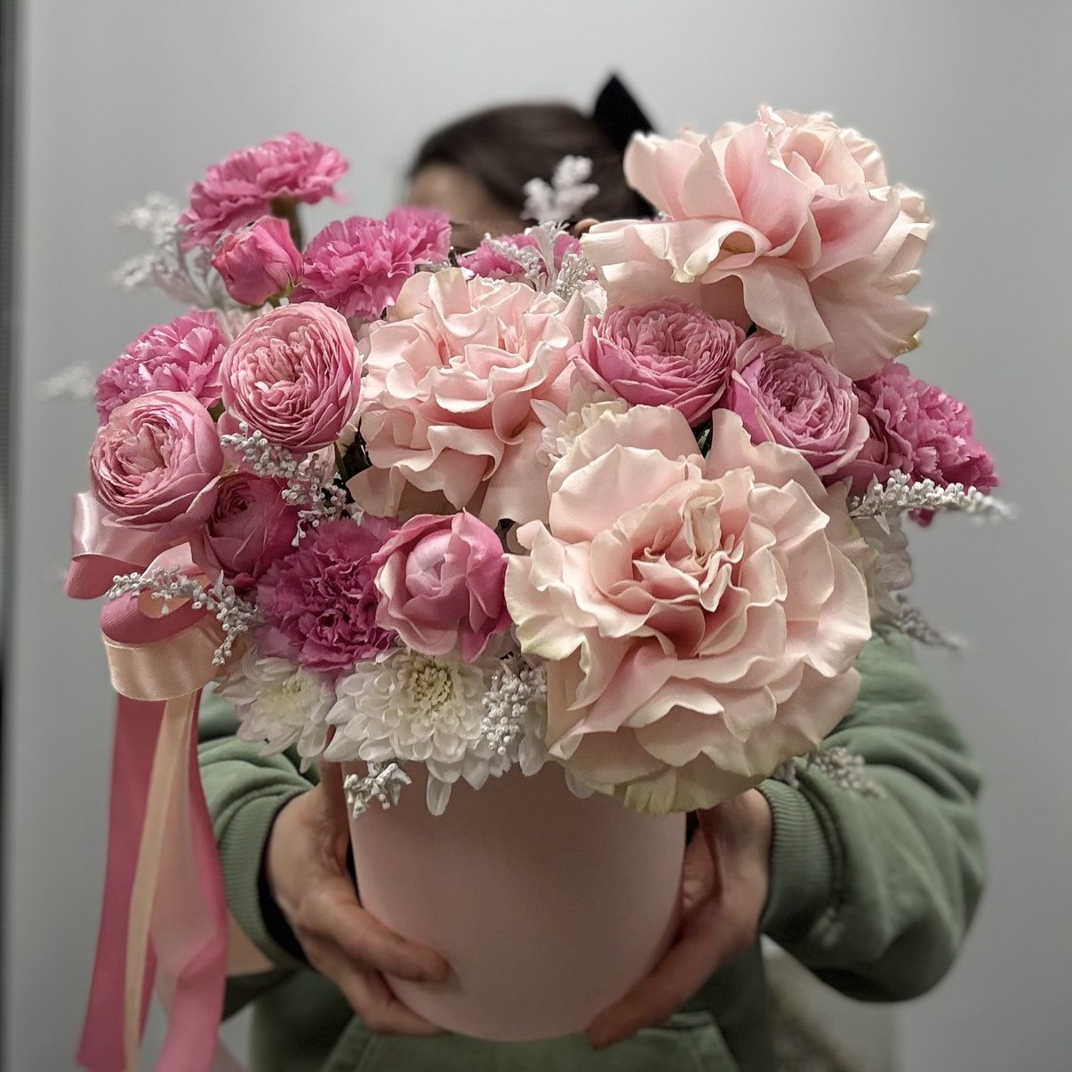 Французские розы-3 шт/розы кустовые-3 шт/диантусы-5 шт/хризантема кустовая-2 шт./оазис/шляпная коробка/тишью.