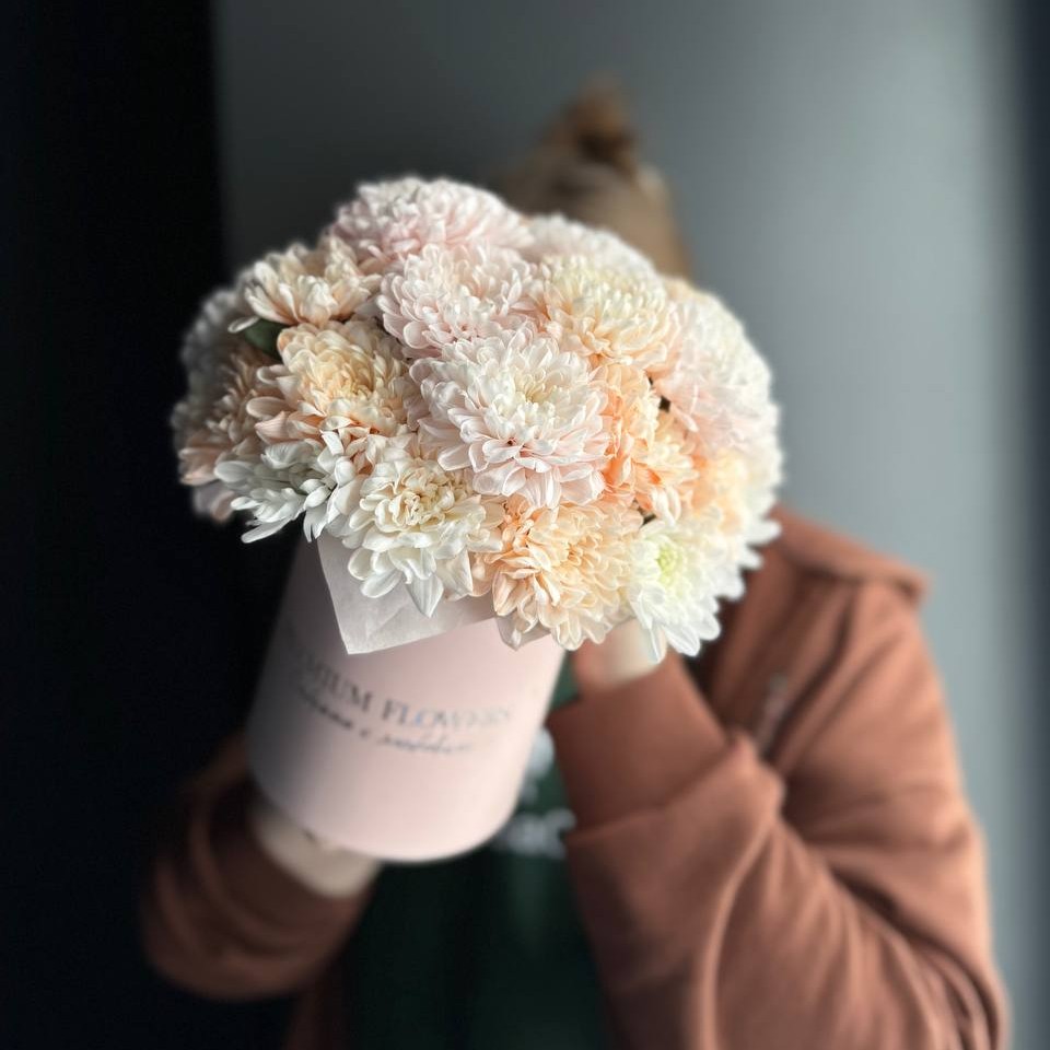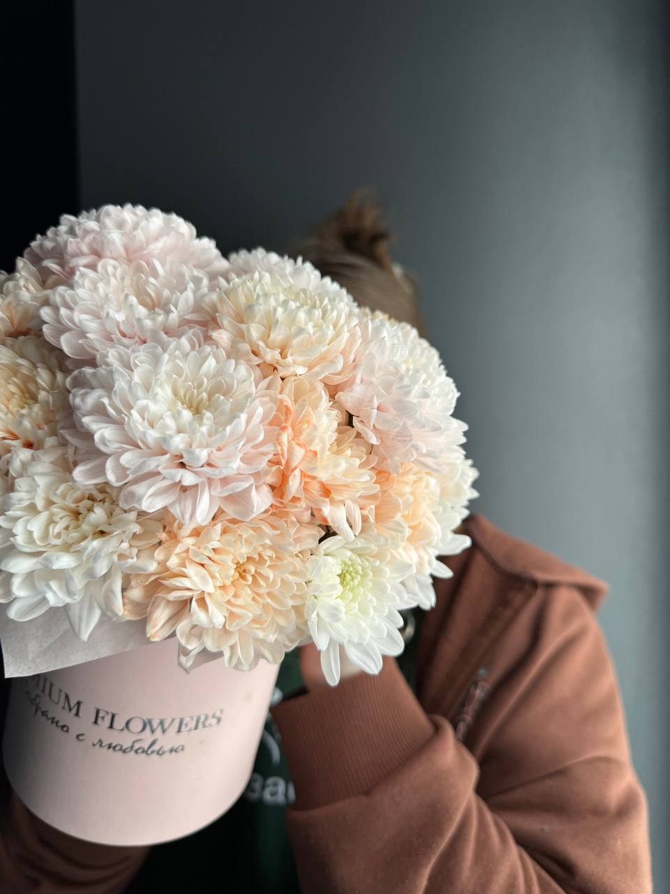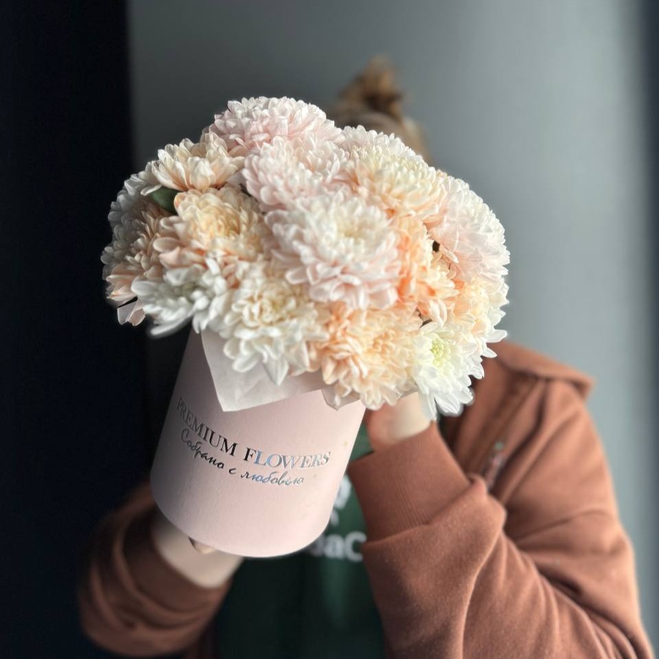 Хризантема кустовая сортовая крашенная-3 шт/оазис/шляпная коробка/тишью.