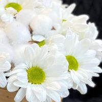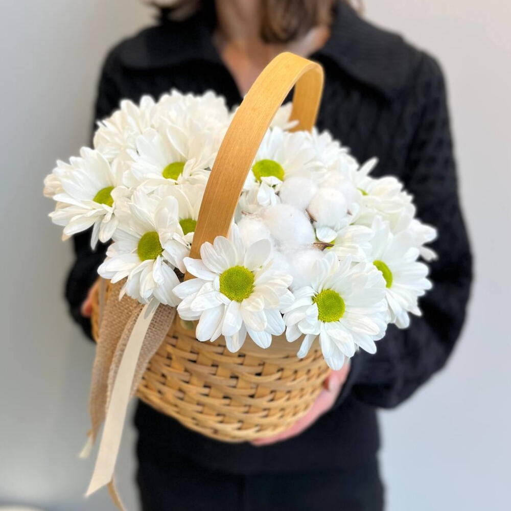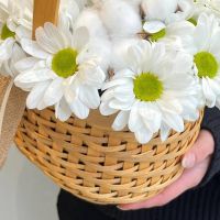 Хризантемы кустовые-3 шт/хлопок-3 шт/корзина/оазис/лента.
