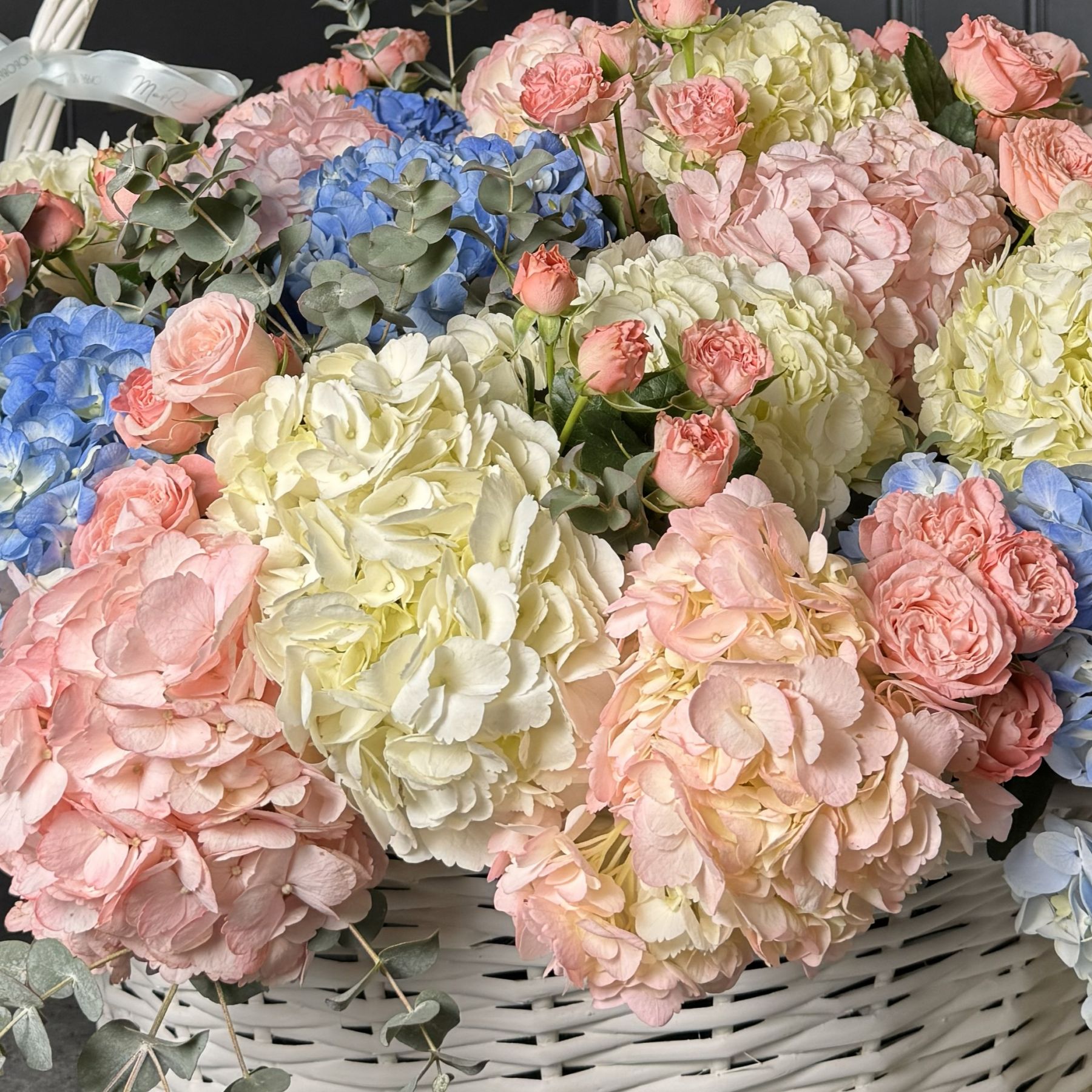 Гортензии сортовые-19 шт/розы кустовые-9 шт/эвкалипт/корзина/оазис/лента.