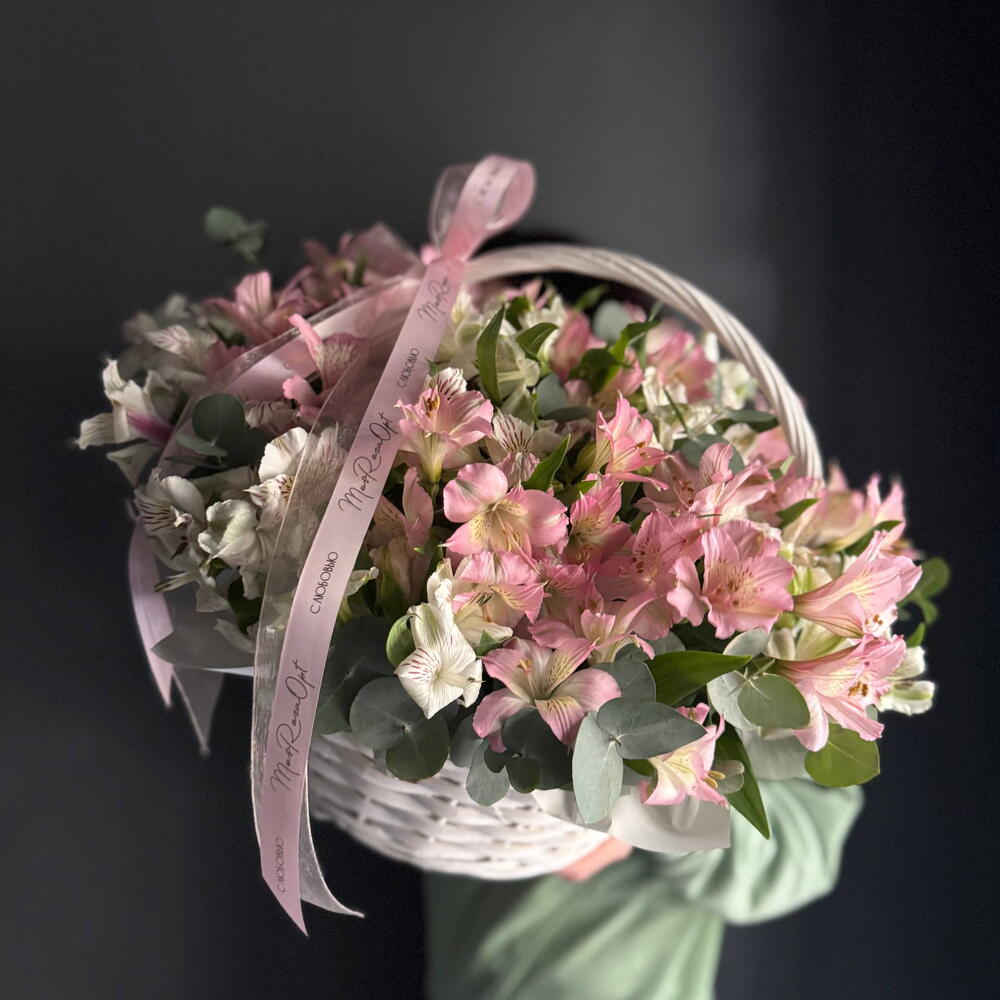 Альстромерии-31 шт/эвкалипт/корзина/лента.