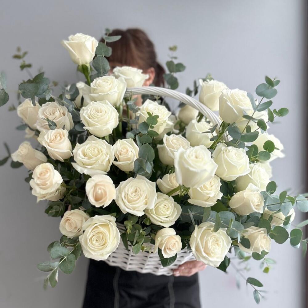 По вашему желанию можем собрать корзину из белых роз, красно-белый микс, разноцветный микс(красные/белые/розовые/оранжевые/желтые).