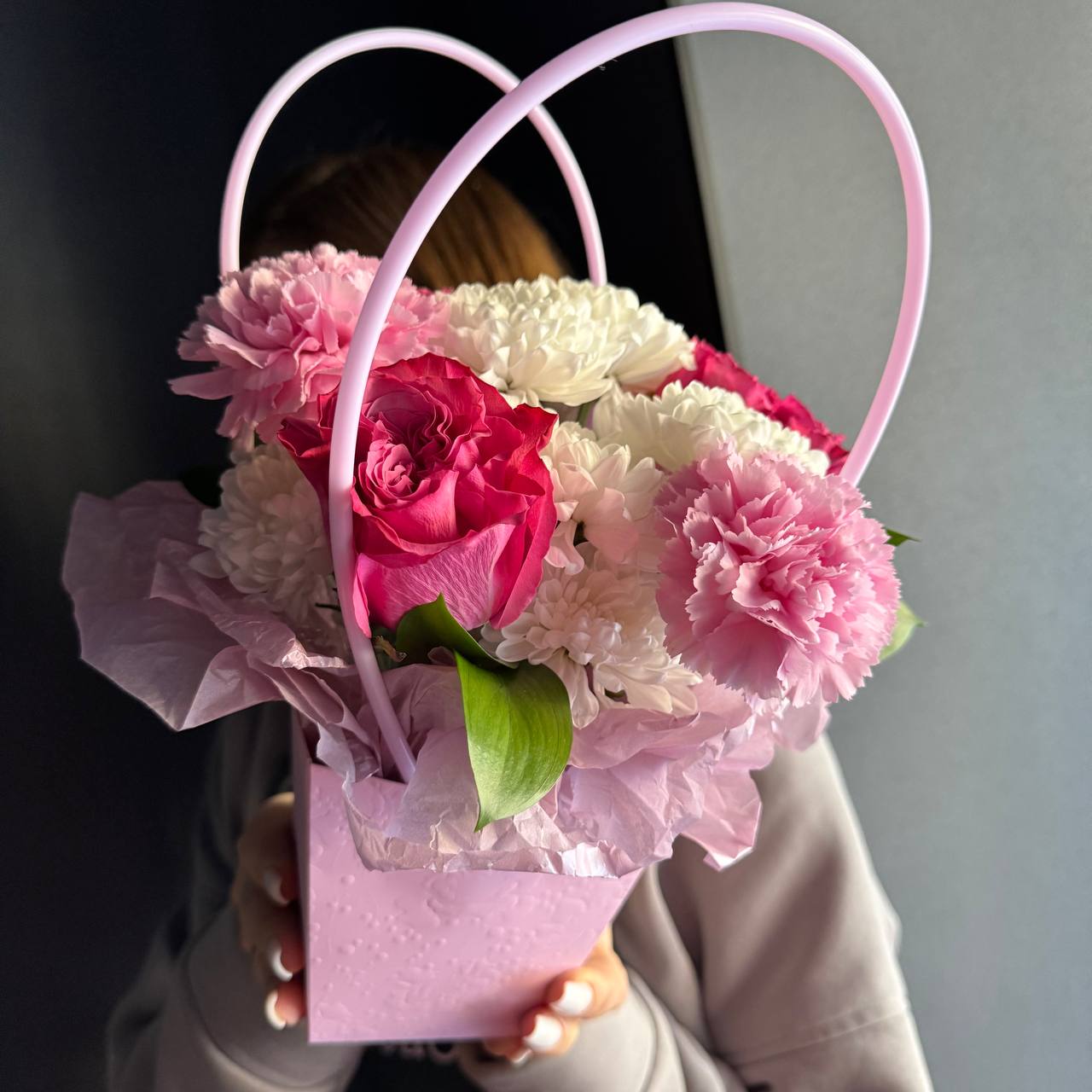 Хризантема кустовая/роза сортовая одноголовая/диантусы/рускус/сумочка/лента.