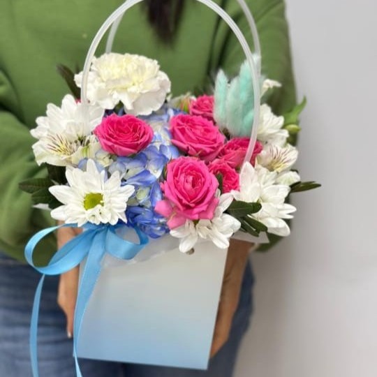 Роза кустовая/гортензия/ альстромерия/хризантема кустовая/диантус/писташь/лагурус/пиафлор/сумочка/лента.